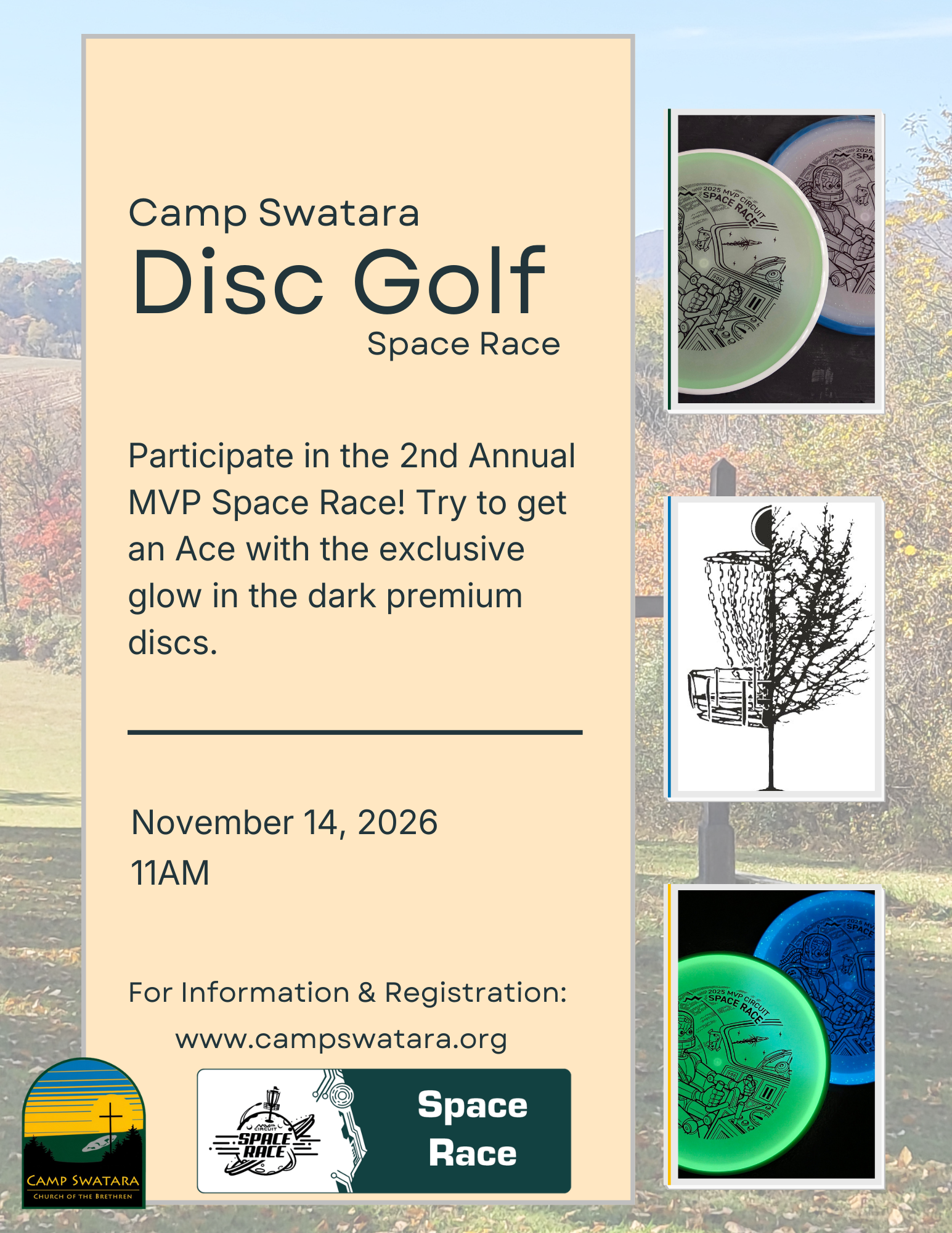 Disc Golf Space Race Saturday, November 14, 2026 11:00 AM 2:00 PM 11:00 14:00 Camp Swatara 2905 Camp Swatara Road Bethel, PA 19507 USA (map) Google Calendar ICS Participate in the 2nd Annual MVP Space Race! Try to get an Ace with the exclusive glow in the dark premium discs.Download Flyer
