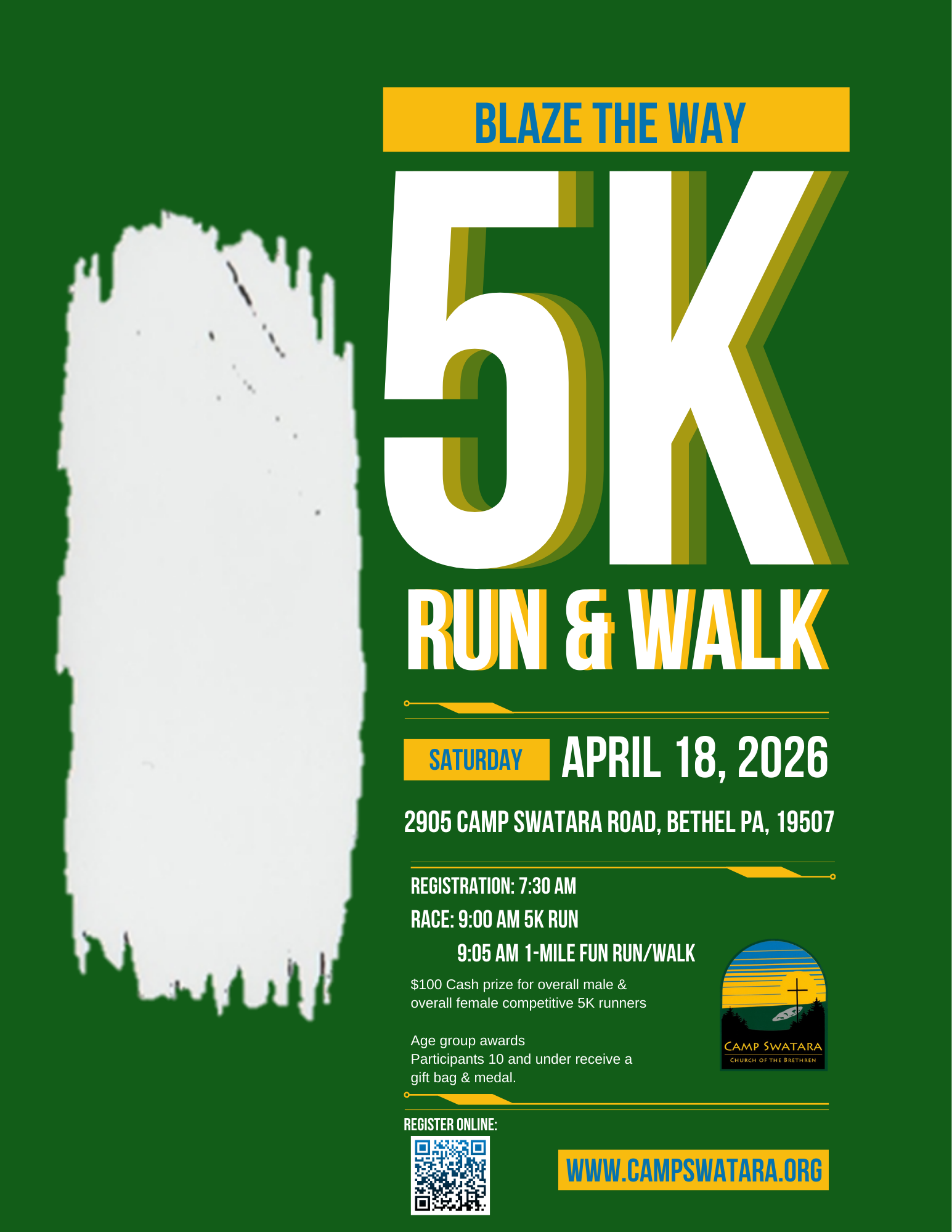 Experience all of Camp Swatara on a 3.1 mile loop or a 1 mile run/walk through the campground at our 1st 5K Blaze the Way.