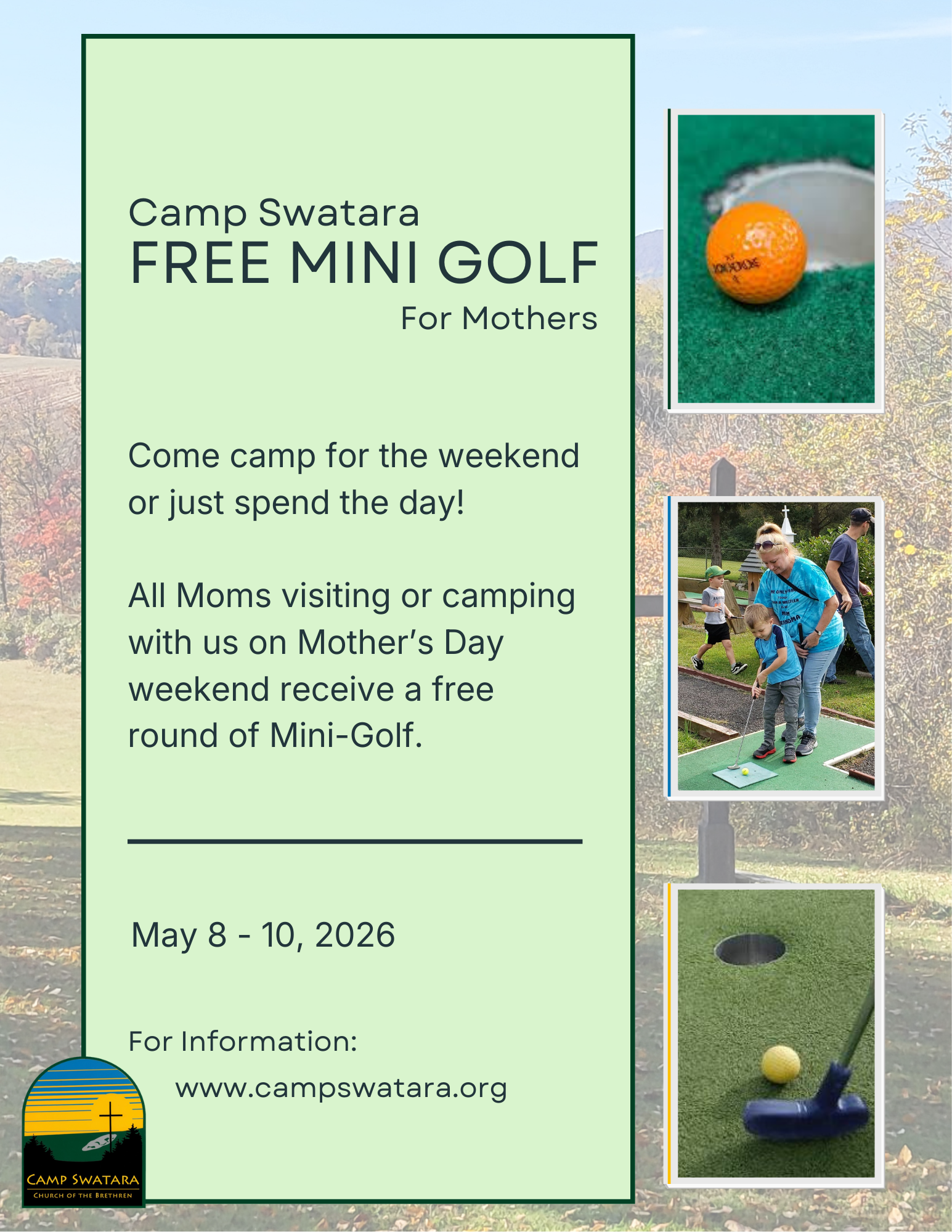 Come camp for the weekend or just spend the day! All Moms visiting or camping with us on Mother’s Day weekend receive a free round of Mini-Golf. You will receive your ticket when you check in at the Camp Store.